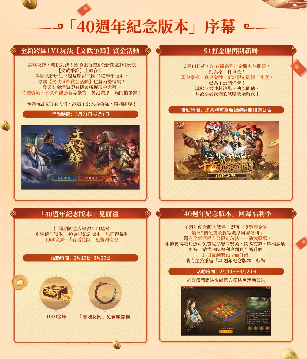 所有主公可於2月10日至3月20日期間登入遊戲,即可直接領取 「40週年紀念版本見面禮」,包含1000金銖及免費40週年鏖戰造型。針對回歸主公,更有回流專題頁、全新「演武戰場」玩法及豐厚簽到獎勵,助力老玩家重返沙場。