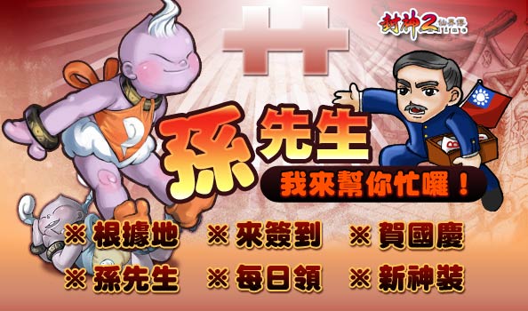 國內老牌遊戲《封神2仙界傳Online》也特別於10月4日(二)至10月18日(二)這段期間舉辦一連串的國慶活動,光聽名稱就非常有氣勢,名為「孫先生,我來幫你忙囉!」,讓玩家在歡欣的氣氛中體會國父當年創國維艱的革命過程。