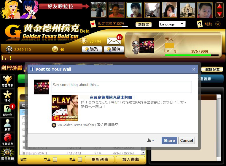 《黃金德州撲克》直接玩:http://apps.facebook.com/goldengame_poker/