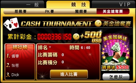人外有人、天外有天!各位《黃金德州撲克》的高手,是時候證明你的實力了!即日起至12月15日活動期間,至競技區參加「美金搶奪賽」,每局獲得的勝利籌碼與勝利牌型都將換算成積分累計,每週總積分冠軍即可獲得大獎500元美金與冠軍徽章!前20名的玩家也能獲得百萬籌碼,超值獎勵等你來拿!