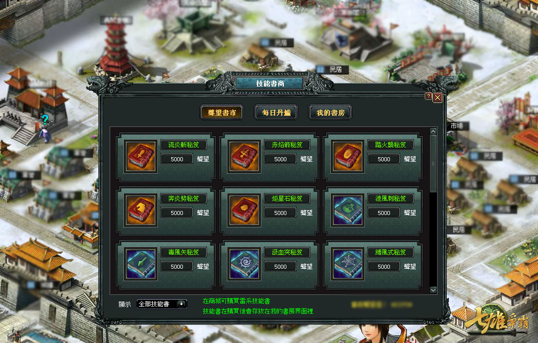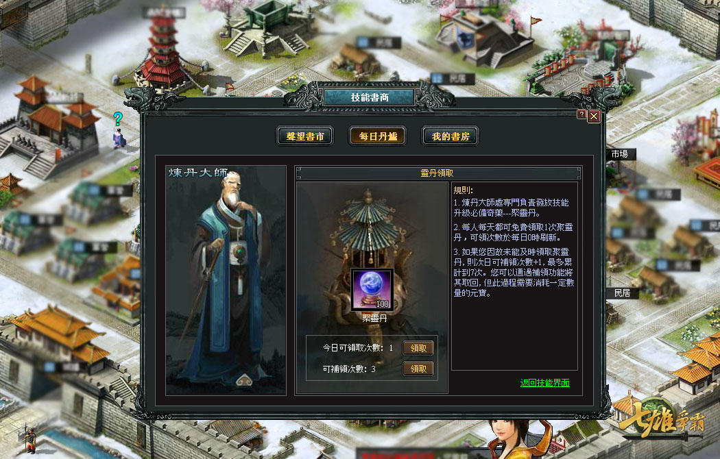技能除了分成五種不同系別之外,每個技能共分四個層級,每一個層級共有10級,武將必須透過『技能點』與『聚靈丹』才能提升技能等級,玩家每天可透過主城中的【技能書商】領取『聚靈丹』之外,還可從每日聲望任務、抗擊匈奴等活動中獲得『技能殘頁』來換取技能點數。