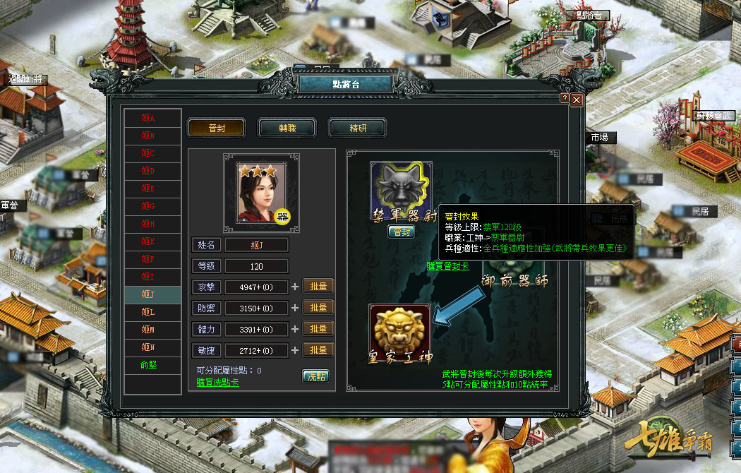 目前在遊戲中武將等級上限為120級,君主們面對重重關卡仍力不從心,這時候【武將晉封】就是各位最好的選擇,君主們可透過【武將晉封】將手中的武將轉化提升為三個階級分別為『禁軍』、『御前』、『皇家』,每個階位分別有120級,君主們的武將只要等級達到120級之後,即可晉封提升到下一階級『禁軍』,依此類推,最高可達到『皇家』階位。