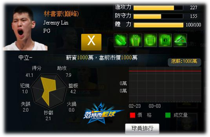 林書豪的崛起不但在全世界造成旋風,他永不放棄的故事也給球迷很大的鼓舞。現在《范特西籃球》提供了見證林書豪風潮的機會,即日起至3月31日,各位經理人只要用林書豪完成25場匿名比賽、點亮「超越林書豪」榮譽,並用林書豪在NBA挑戰賽戰勝其中任意4隊,總消費金額超過10,000飯卡,就可獲得14天的顛峰林書豪。讓各位經理人帶著林書豪一起打遍天下無敵手!