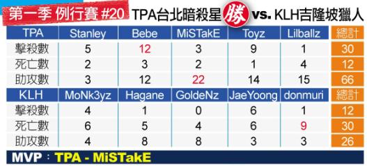 接著「台北暗殺星」以沉著穩健的節奏,靠著團隊默契極積進攻,並且保持地圖上視野的能見度,來掌握敵方選手動向,取得所有的優勢。最後「台北暗殺星」在累積大量擊殺數、大幅度金錢領先的前提下,取得這場比賽的勝利。