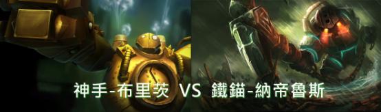 在這場「台北暗殺星」對上「西貢小丑」的賽事中,最特別的地方就是在選角上雙方都選擇了侵略性強,操作上也有些許的雷同的兩隻英雄。「台北暗殺星」隊長MiSTakE少見的選擇了下路走位、壓制力非常強的布里茨來擔任輔助位置;而「西貢小丑」的Junie則選用納帝魯斯,同樣可以藉由勾住目標來破壞對手陣型。