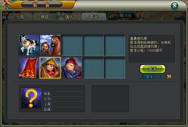 武將名士厲害,也要穿衣服,總不好來個裸攻吧!! 因為得不到高級裝備而憂愁滿面嗎?《尛名將》的委派商人幫你解決煩惱!在遊戲建築商店中,除了提供玩家強化裝備外,還提供了獨特的「委派功能」,玩家只要透過委派「馬匹商人」以及「披風商人」,將有機會獲得高級寶馬及高級披風,而且在委派商人的同時,還有機會可再獲得更加高級的商人,從此讓你擁有高級好裝免煩惱!