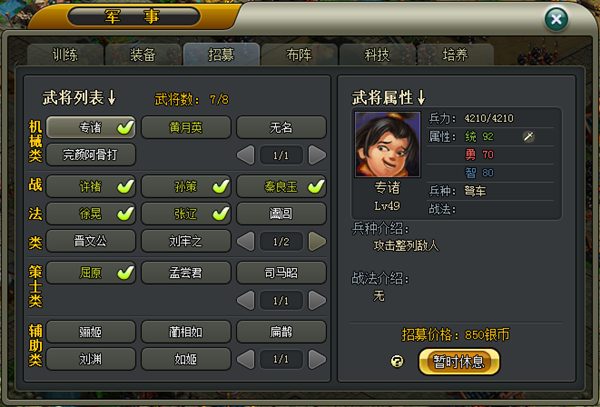 在遊戲中凡透過野外推圖打敗該武將或是領地升級,就可以輕鬆擁有歷代知名武將,藉此提升自己的戰鬥力!武將共有智、勇、統三個屬性,分別對應武將的策略攻擊、戰法攻擊、普通攻擊,屬性越高對應的數值也越高,對玩家來說,必需提升武將的屬性才可以在遊戲中大獲全勝!所以不管是你是智勇雙全或勇者無懼,就算復仇者聯盟現身也要對你退讓三分啦!