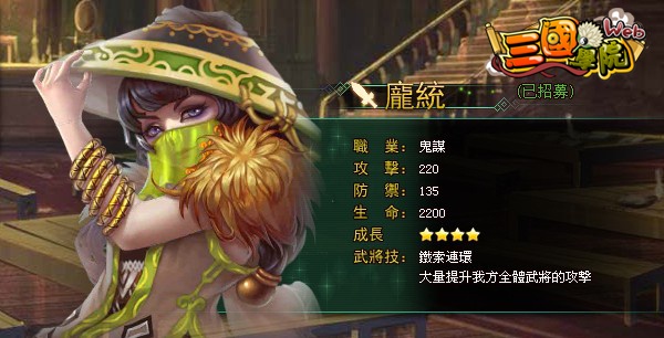 心得:遊 戲中期可招募的武將,聲望需求並不算太高,而基礎能力及成長值對比同期武將為高,稍加培育可成為相當不錯的戰力。武將技是輔助性質,效果為我方全體攻擊強 化,使用後可大幅加強我方輸出,令對手瞬間被殲滅。為達到最佳效果,必須放於第一線的先攻位置,以達至盡快施放技能的目標。