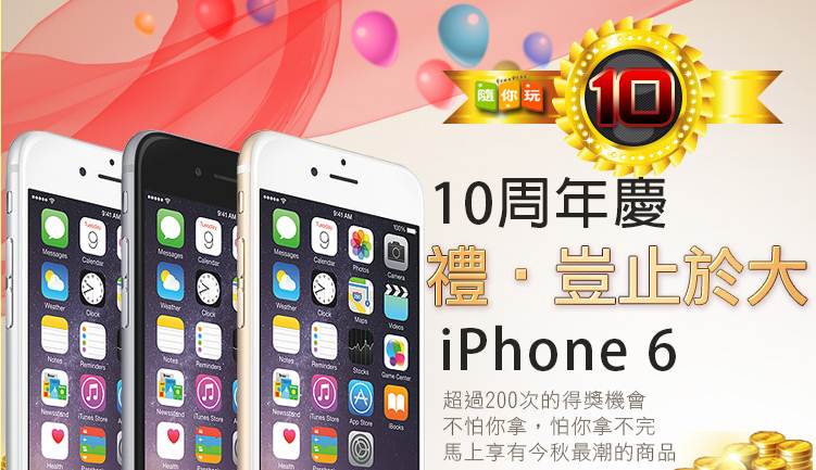 「史上最強10週年慶」~豈止於大!官方這次精心策劃~鋪天蓋地~無孔不入的贈獎!要給玩家們的就是一個「爽度」!自10月 1日至10月 7日止,只要天天登入「Gametower平台」旗下任一款休閒棋牌博弈遊戲,即有機會獲得iPhone 6 (16G)一支,天天登入天天送唷!週年慶必看iPhone 6 攻略:
