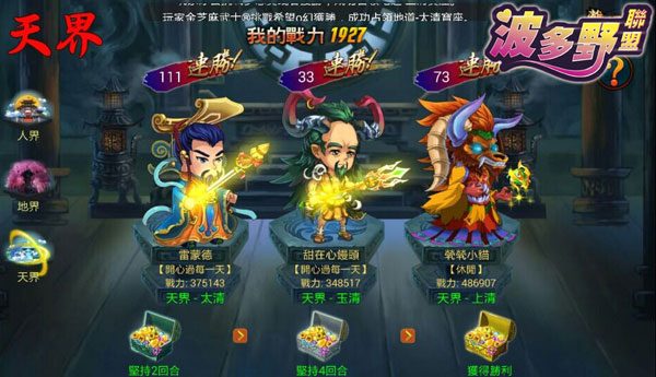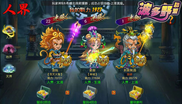 在「戰三清」系統中,玩家通過打擂與守擂的方式爭奪伺服器的前三名,玩家在擂台上堅持的回合越多,那麼得到的獎勵越豐厚,當玩家在守擂同時,別的玩家可以不斷的對擂台上的玩家進行挑戰。