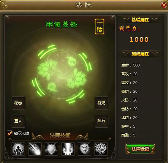 法陣目前共分為7階,玩家可透過消耗「法陣進階石」對法陣進行升階,法陣每次升階成功,都可以獲得更高的戰鬥力及更炫酷的造型。法陣共有6個技能,品階達到2階後可以獲得第1個技能,之後每提升1階增加一個新技能,法陣達到7階則可以獲得所有技能。此外,當法陣品階達到4階,則會開啟「法陣成長」和「法陣資質」,從而使法陣的力量更上一層樓。