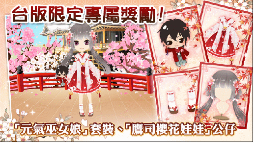 《新章美男大奧 逆後宮浪漫譚》現正如火如荼展開事前登錄,參與活動的玩家可於遊戲正式上線時,至遊戲內【御茶所】輸入獎勵序號,即可兌換台版限定的『元氣巫女娘』套裝,以及超萌超Q的『鷹司櫻花娃娃』公仔喔!而官方本次