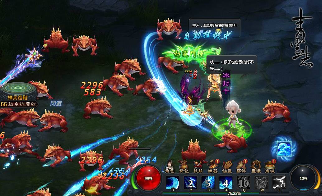在《青雲志》中曆練修行,打怪練功任務繁重,想要有人助你一臂之力嗎?當修行到7級以後,就可以獲得一隻Q萌可愛的「天眼靈猴」小跟班,陪你一同修行。靈猴不僅能幫主人打怪,提供大量屬性,而且技能多多!在啟動天賦技能後,它的靈活動作、一撓一抓均附帶特效,提供暴擊、回血、減速、中毒、額外等傷害,而且隨著它的逐漸成長,會獲得更多技能!