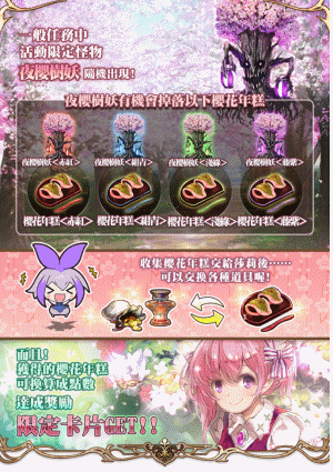 系列活動,推出「賞花!櫻花年糕大作戰」與新限定卡「★7春櫻庭園古爾比蒂」。在一般活動任務中,將有機會出現活動限定妖怪「夜櫻樹妖」,「夜櫻樹妖」有不同類型,皆會掉落不同顏色的【櫻花年糕】,只要累積一定年糕,便可以尋找莎莉兌換各種道具,且獲得年糕即可累積點數,達成獎勵之後,便可以兌換本次活動限定卡片「★7春櫻庭園古爾比蒂」!