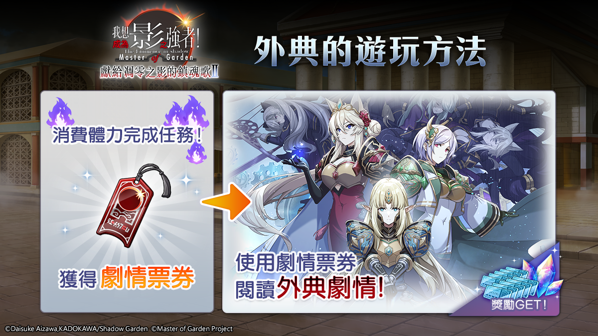9/5(四)維護後,開始舉辦活動外典『獻給凋零之影的鎮魂歌Ⅱ』,消費體力完成任務來獲得「劇情票券」,並使用「劇情票券」閱讀外典劇情,一邊享受劇情,一邊獲得豐富獎勵吧!挑戰活動限定關卡及 Boss 來獲得角色碎片、幻魔石等豐富獎勵,遊玩活動收集活動硬幣&討伐積分 pt,活動硬幣可至活動商店兌換各式素材,有機會獲得大量養成素材,千萬別錯過!