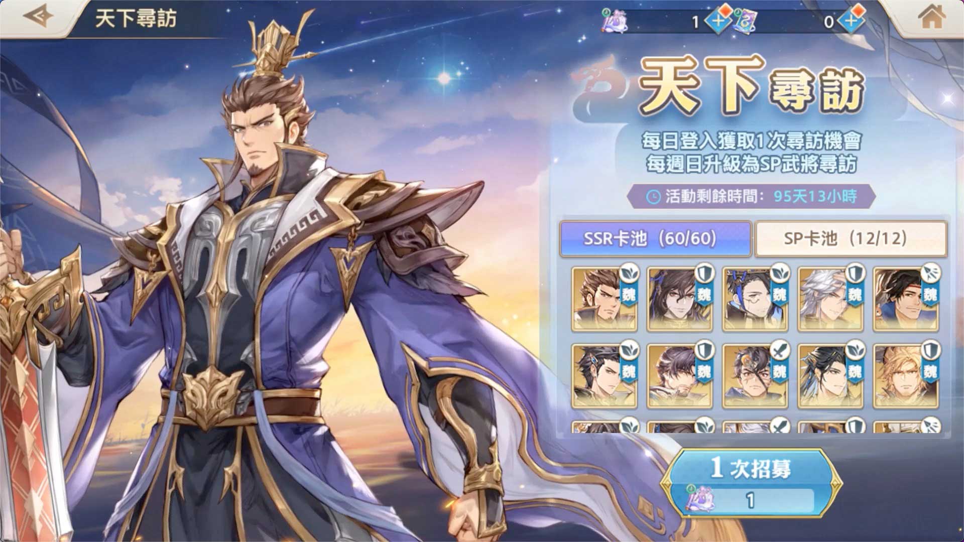 二週年「Global新世界服」上線第一大福利活動---天下尋訪,12SP+60SSR武將直接免費獲取!城主只需每日登入即可獲取1次尋訪機會,1次尋訪機會可招募1個SSR武將!每週日則會升級為SP武將尋訪!