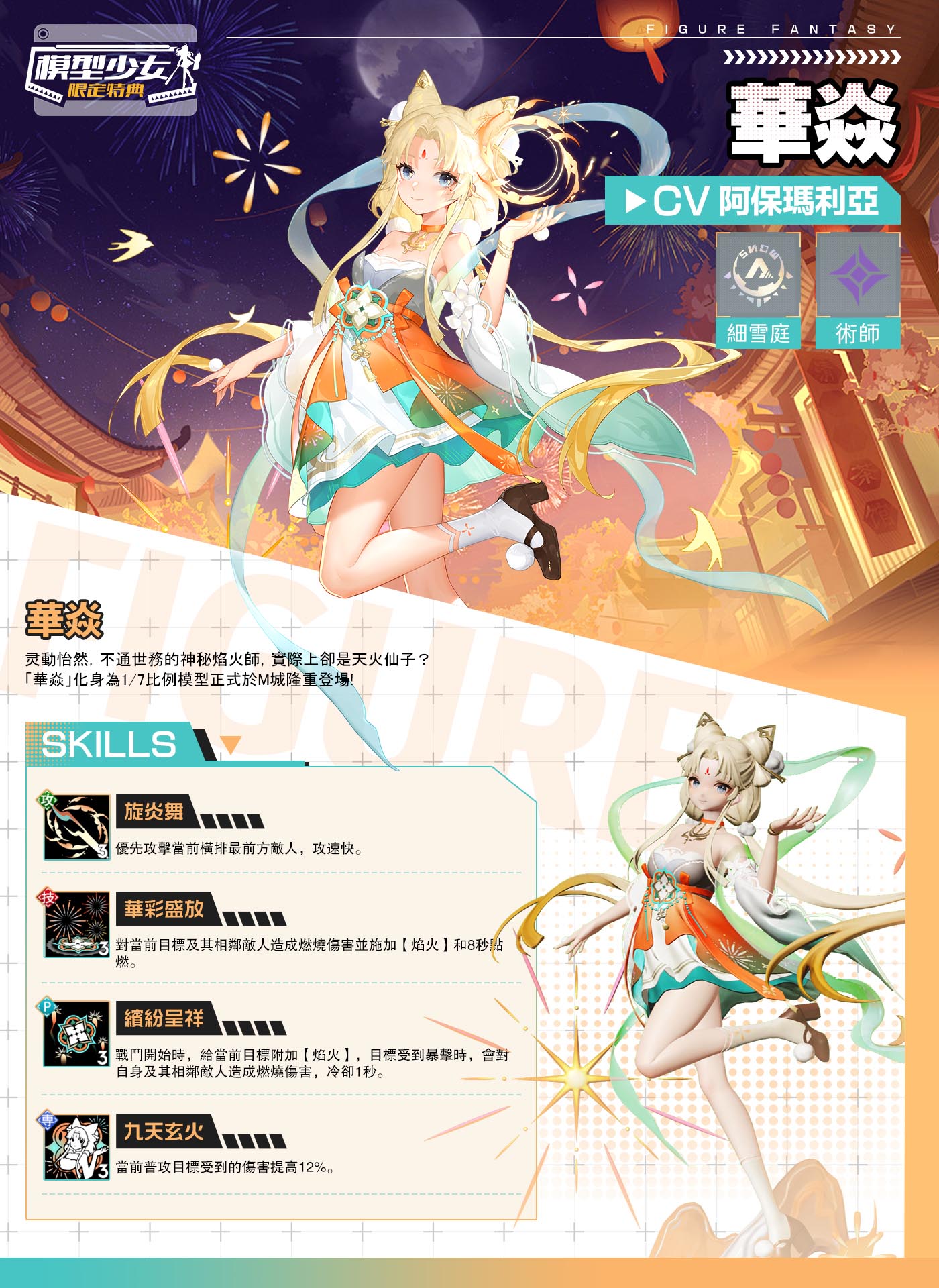 燈火璀璨之間,華焱的身影如夢似幻。她輕踏巨型鯉魚花燈,身旁伴隨著七彩煙火。當你終於在人群中找到她,她卻嬌羞的說著:「你來得太遲了!你可錯過了本仙的開幕秀呢!那我便罰你…來年繼續陪我共遊人間吧!