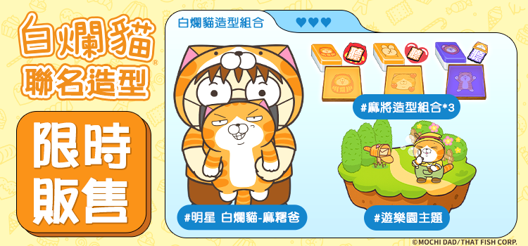 ,以及「白爛貓麻將造型組合」,裏頭包含了聽牌特殊提示,還有主題麻將牌背、桌布等獨家好禮,讓你的牌局充滿白爛貓的趣味風格,一起加入白爛貓宇宙吧!