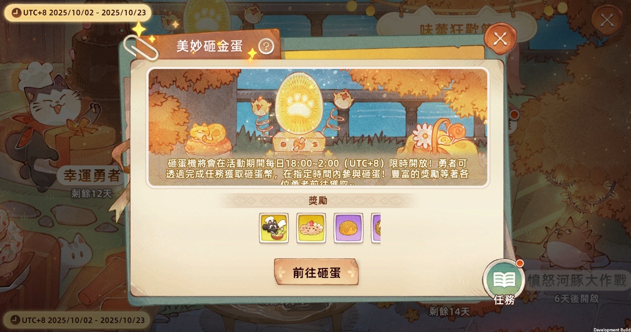 【美妙砸金蛋】活動同步開啟,勇者消耗砸蛋幣進行砸蛋,可免費獲取「漢堡沙發」、「珍珠奶茶溫泉」等限定美食主題家具,以及「毛球大廚」背飾、秘器之心寶箱、福袋禮券等驚喜好禮。