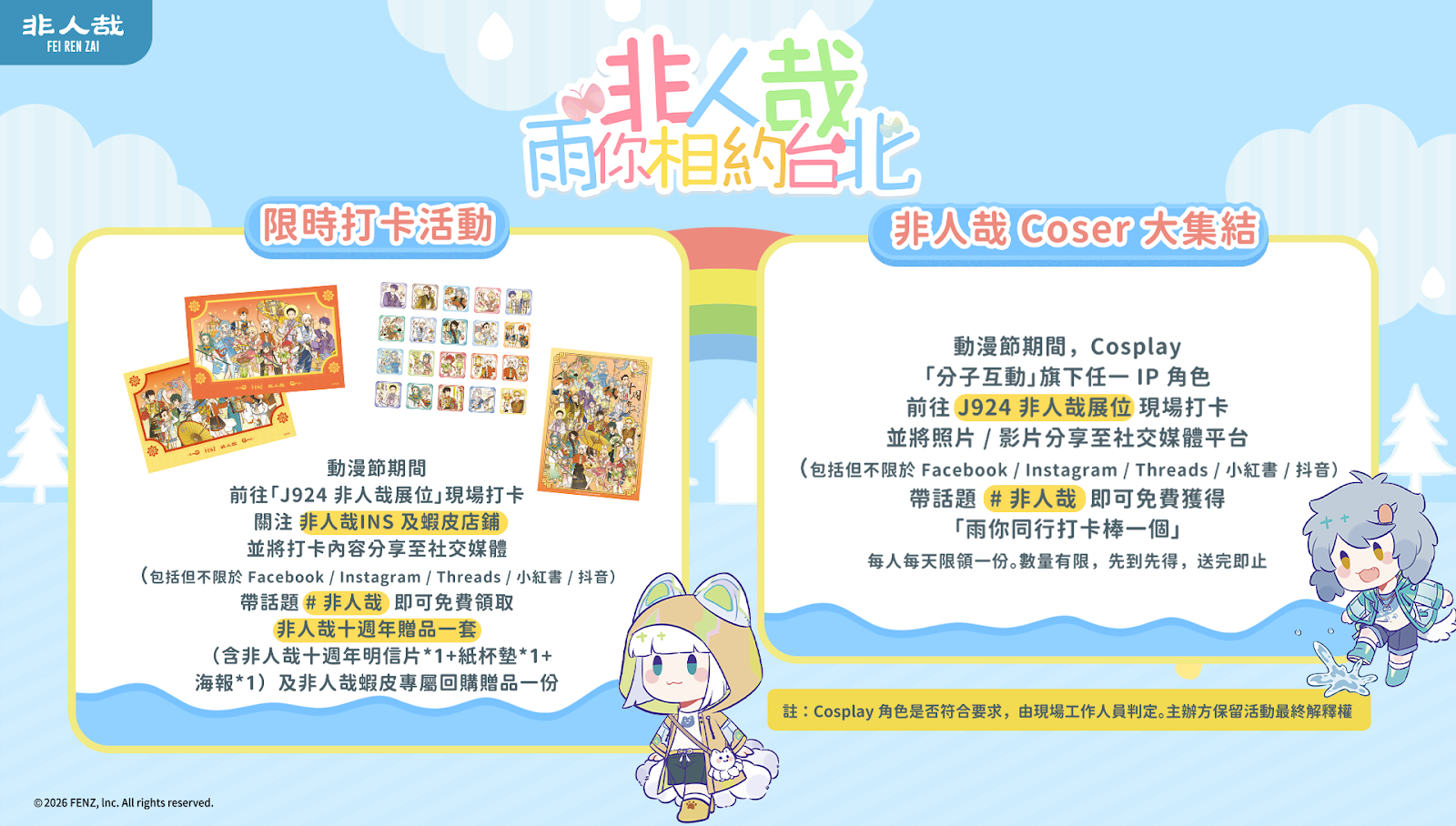 Coser 加碼賞:若粉絲身著《非人哉》 角色 Cosplay 服裝來到攤位並完成關注任務,將額外加碼贈送「非人哉-雨你同行系列-打卡棒盲盒」乙個,同樣每天限量,送完即止!