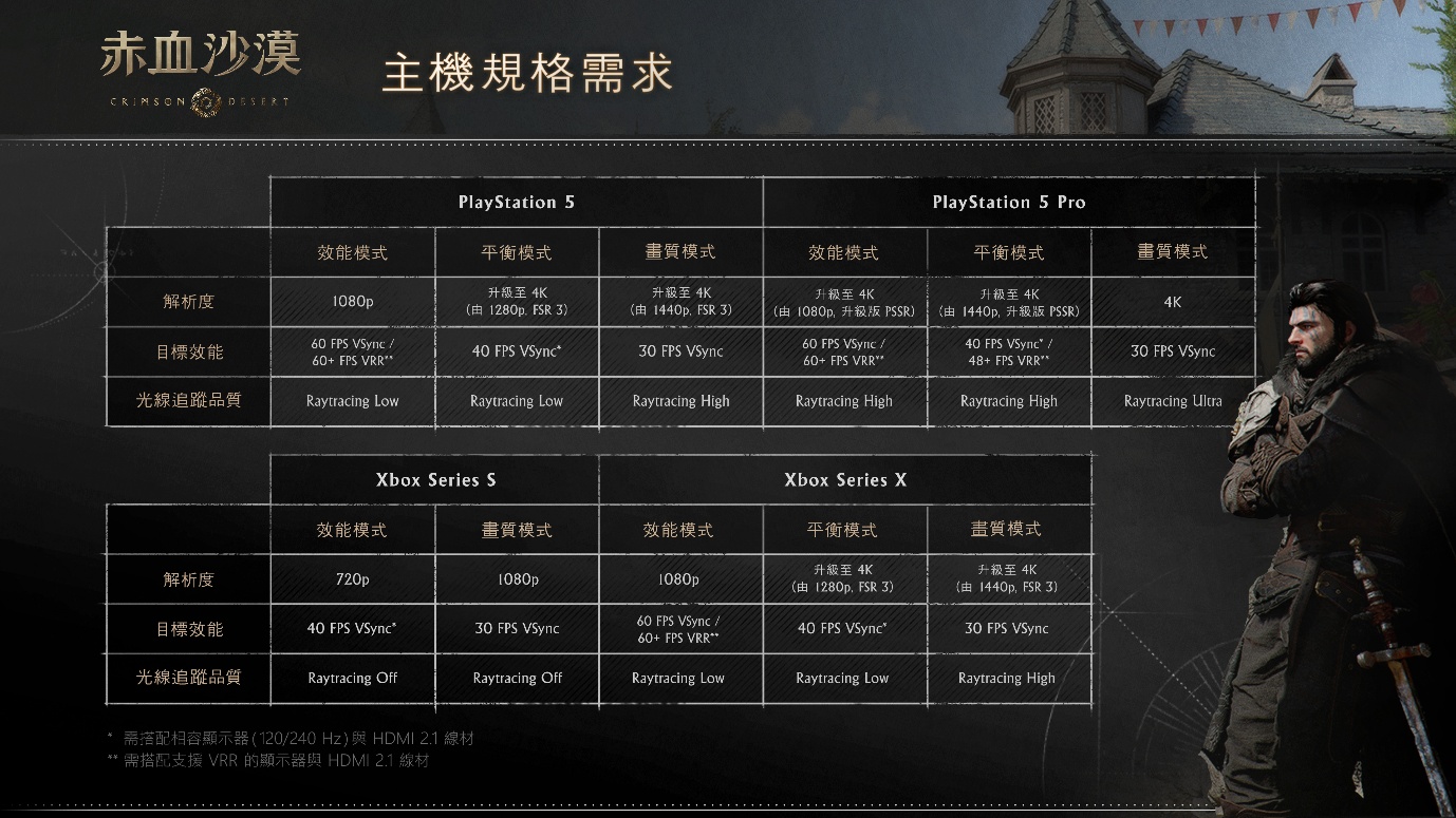 【2026.03.11 mirror 訊】 韓國遊戲研發商珍艾碧絲公開旗下開放世界動作冒險新作《赤血沙漠》PC、主機平台玩家硬體配置所對應的遊戲效能與建議設定。PC部分依據規格提供6種圖像預設功能,主機則透過「效能」、「平衡」、「畫質」等3種模式為玩家帶來舒適的遊戲環境。