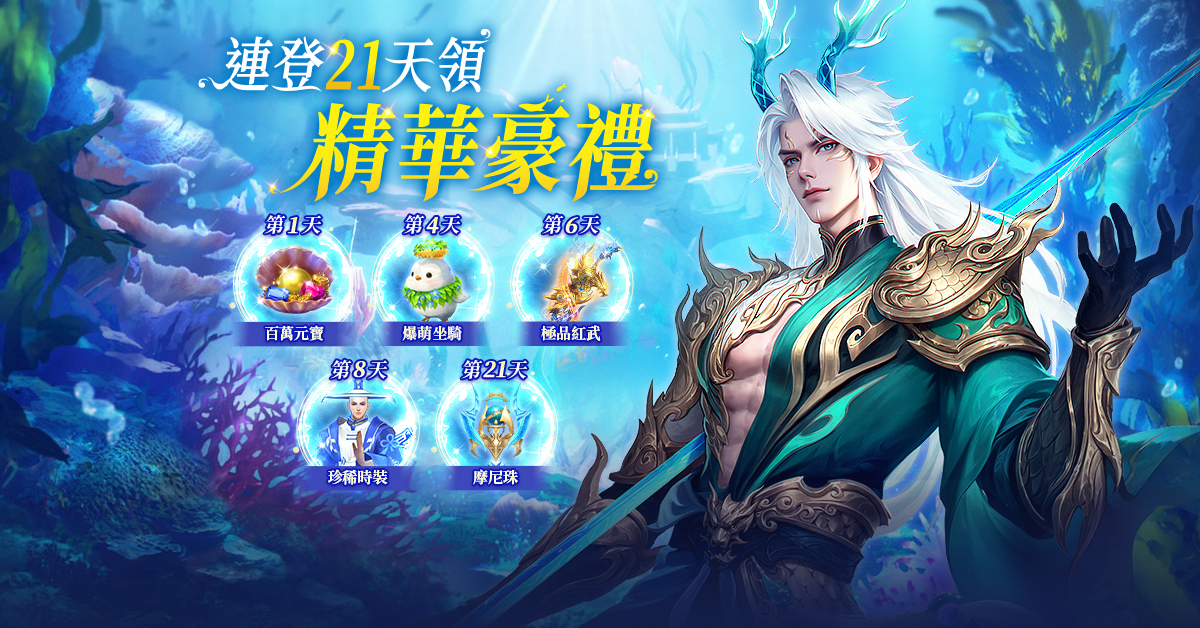連續登入21天,還可領取百萬元寶,爆萌坐騎,極品紅武,稀珍時裝,摩尼珠等好禮!各位神域使者千萬不要錯過這波提升戰力的大好時機,立即下載遊戲,參與開服活動,搶先領取所有限定獎勵,開局直接覺醒海龍血脈,強勢起飛!