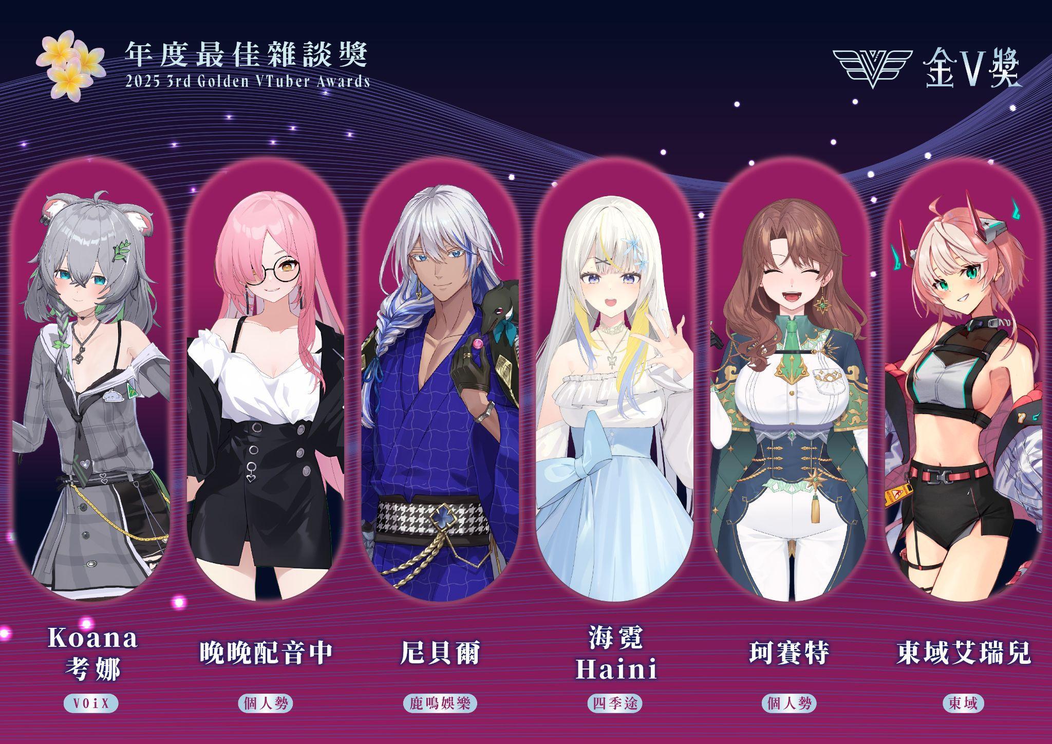 【2025.11.03 mirror 訊】 公共電視主辦之2025年第三屆「金V獎」2日線上直播公布入圍名單,今年總徵件數達358件,其中「年度最佳演唱實力獎」再創新高達88件、新設立的「年度最佳雜談獎」56件、「年度最佳翻車沒極限獎」50件,為此次投稿數競爭最激烈的前三名。雜談獎為今年新設立的獎項,不靠畫面取勝,而是以過往直播的無剪輯五分鐘雜談進行評分,最後增額入圍六位,由考娜、晚晚配音中、尼貝爾、海霓、珂賽特、東域艾瑞兒共同角逐,用VTuber最基本的武器「說話」來一決勝負。