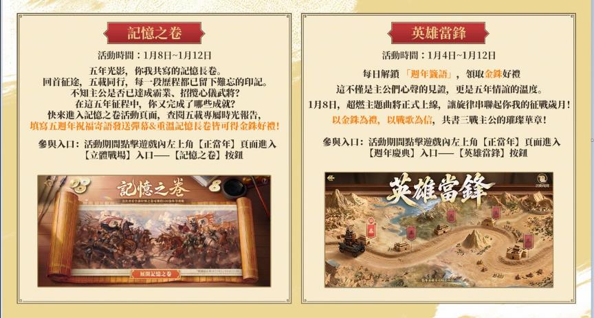 官方推出的「戰略・正當年」版本系列福利活動目前正在火熱進行中。其中,玩家參與「礪戰五載」 活動累計最高可獲得隨機金將、招募券和金銖等多重好禮,享受豐厚的福利獎勵。而從1月8日開始,遊戲內還將推出「記憶之卷」專屬活動。玩家可以進入遊戲查看個人專屬的五週年時光報告,與其他玩家共同回顧在《三國志・戰略版》中的熱血歲月,填寫五週年祝福寄語並發送彈幕留言,還可獲得金銖好禮。
