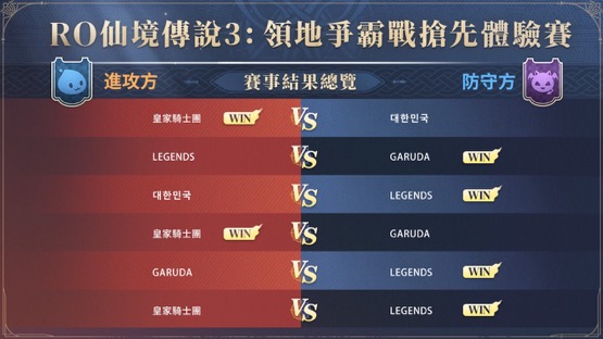 本次活動邀請玩家組織公會參賽,由皇家騎士團대한민국LEGENDSGARUDA四支公會共同參加,採跨區友誼賽形式進行。玩家首次在正式對戰中體驗領地爭霸戰全新玩法「巔峰對決」,享受緊張刺激的多輪對戰與團隊協作樂趣。
