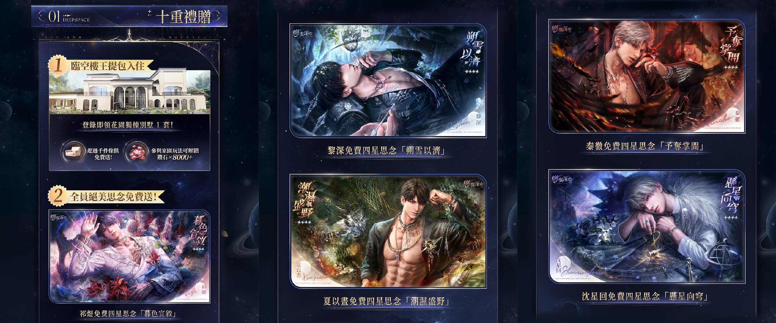 限定許願池「愛,宇宙,詩王座」開啟五星思念限時機率UP活動,獵人可從五位男主的限定五星互動思念卡「沈星回‧洄光頌」、「黎深‧辰寰律」、「祁煜‧宴神曲」、「秦徹‧混沌紀」、「夏以晝‧浴冕歌」中任選3張,所選思念許願機率限時大幅提升,占五星獲得機率的75%。活動期間,許願達到指定次數,可額外領取通用耳飾「搖曳樂章」、深空許願券‧限時×20、男主活動思念配套服飾、自選當期活動五星思念等繽紛獎勵。