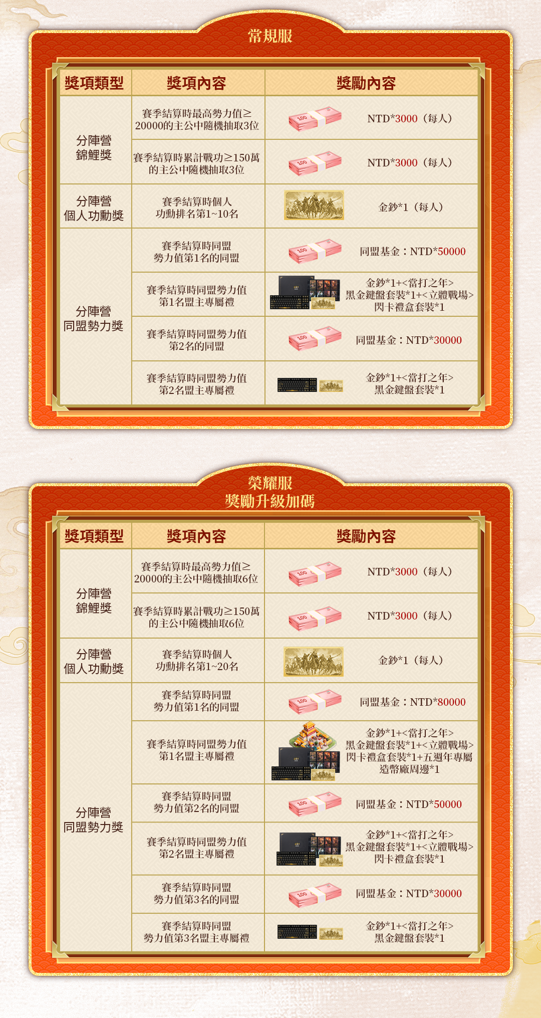 在賞金服中,個人功勳排名前列的主公將獲得限定金鈔;同盟勢力值榜首的聯盟可贏得五萬元台幣的同盟獎金,其盟主更將額外收穫金鈔及專屬周邊套裝。而榮耀服中,不僅個人獲獎名額大幅增加,榜首同盟獎金更可高達八萬元台幣,並配以全套限定周邊,盡顯尊榮。
