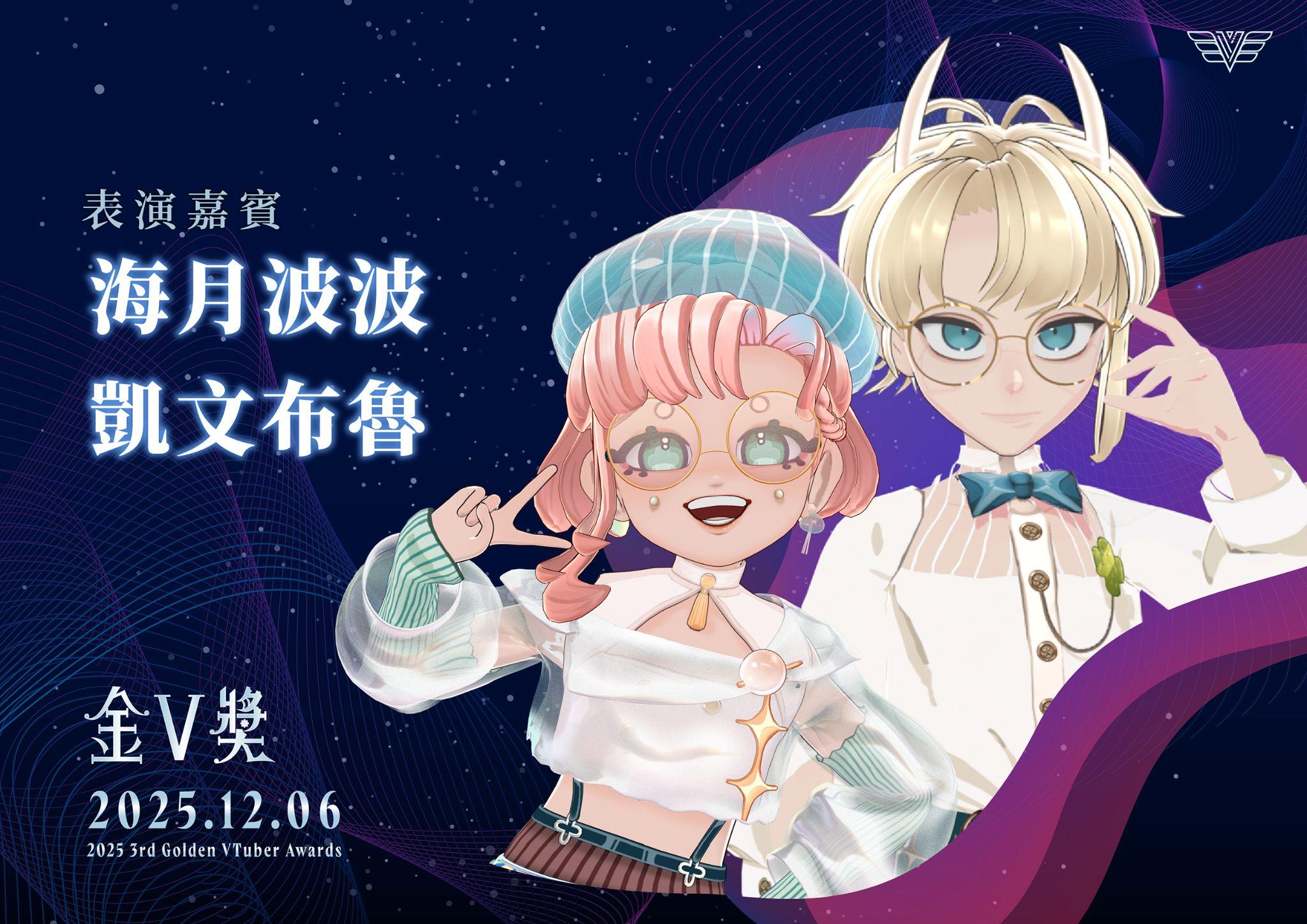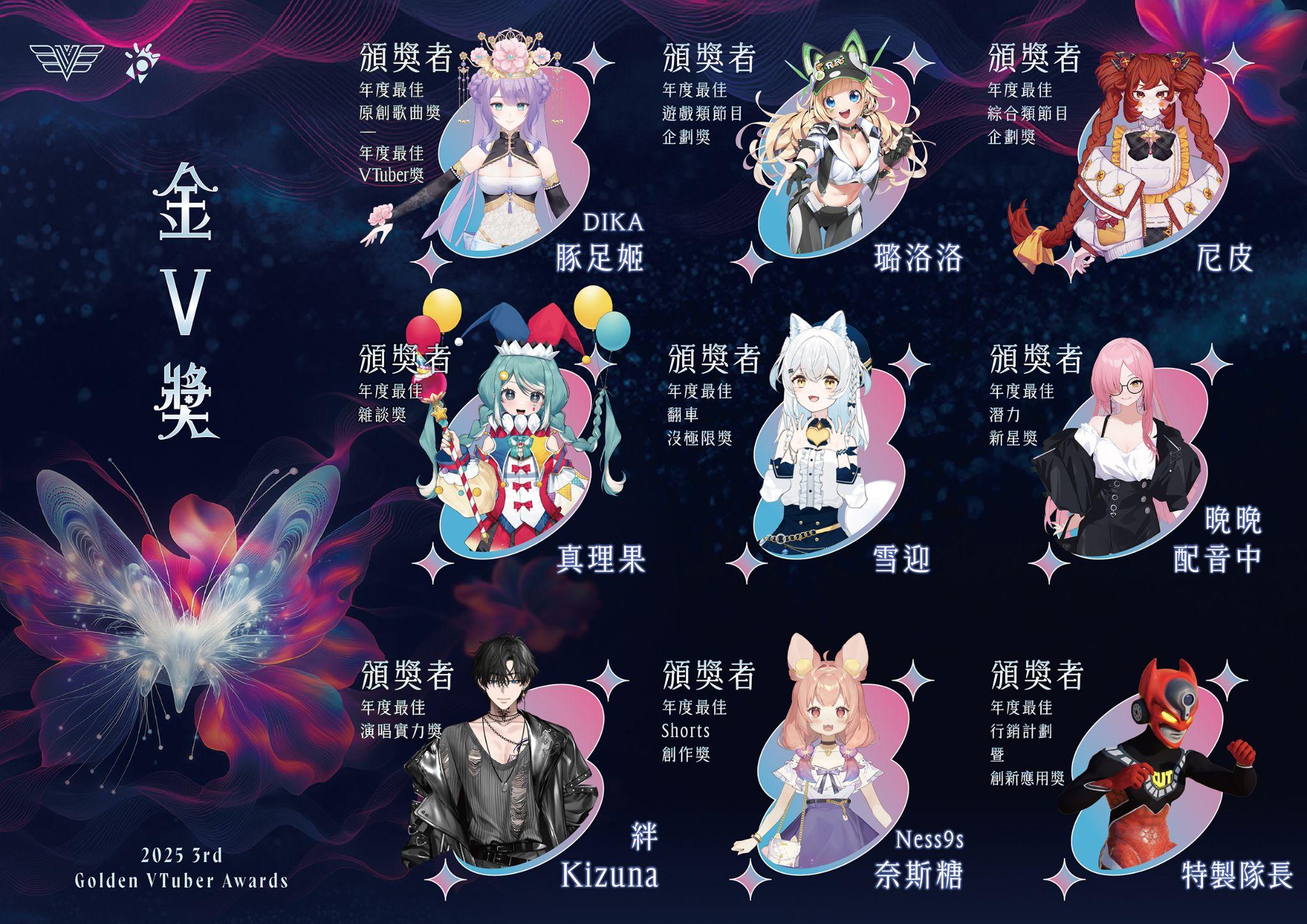 【2025.11.19 mirror 訊】 公共電視主辦之 2025 年第三屆「金V獎」於(11/18)公布頒獎嘉賓、主題曲與第一波表演嘉賓情報。頒獎嘉賓秉持往年傳承的概念,邀請第二屆金V獎得主全數回歸,特製隊長(維碼科技)、雪迎、DIKA豚足姬、絆Kizuna(半點)、尼皮、晚晚配音中、奈斯糖將重新在舞台上聚首,把榮耀接棒給下一屆得獎者。此外,第二屆金V獎主持人璐洛洛特別登場擔任「年度最佳遊戲類節目企劃獎」頒獎人,期望透過自身經營遊戲直播的影響力,鼓勵更多新進創作者;而頻道訂閱剛破30萬,宣布3D型態的真理果也將擔任本屆新設獎項「年度最佳雜談獎」頒獎人,期待將綜藝之神賦予的力量注入金V獎,為熱鬧的年度盛典帶來新的活力。