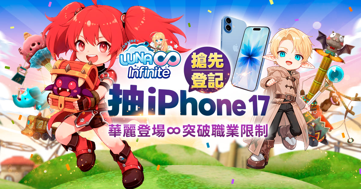 LUNA Infinite》預登錄活動自114日(二)下午3點至1116日(日)晚上11:59止。完成預約的玩家立即可獲得遊戲專屬虛寶大禮包,包含角色養成道具、鑽石等豐富獎勵。此外,官方更祭出超級大獎iPhone17抽獎,參與預約就有機會把最新旗艦手機帶回家!