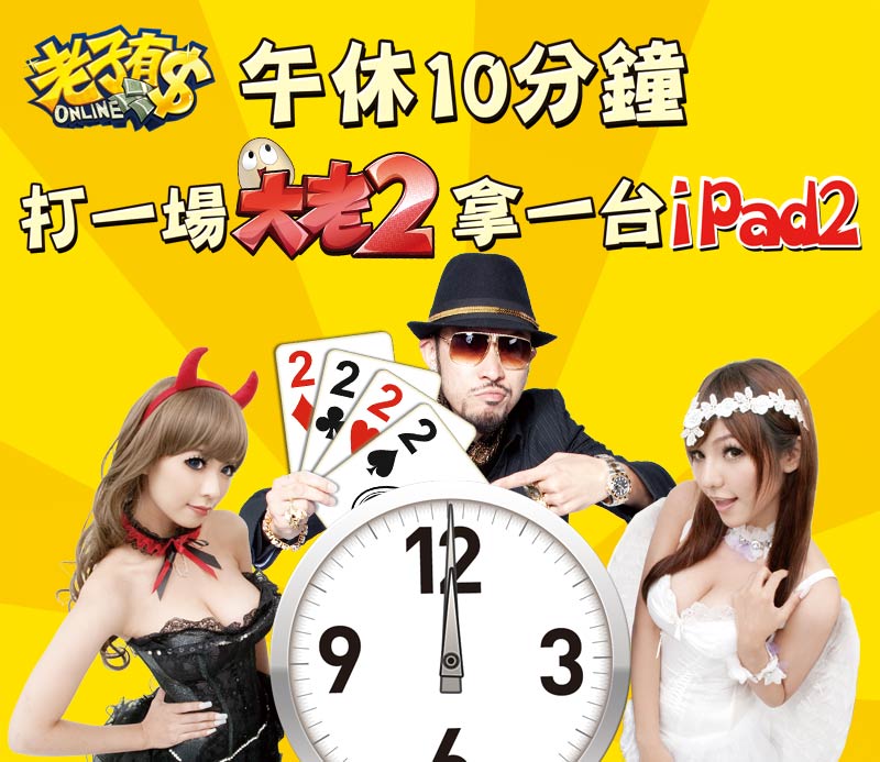 活動口號大喊「午休十分鐘、來一場大老二、拿一台iPad2」,主要是看中大老二遊戲簡單、刺激又可以在短時間內快速結束,很符合現代人忙碌的生活步調,因此有別於其他遊戲連線比賽多在晚上,特別創舉在每天中午舉辦「午休大老二」的比賽,沒想到活動舉辦以來佳評如潮,還有玩家表示每天中午比賽完之後,精神反而更亢奮呢!