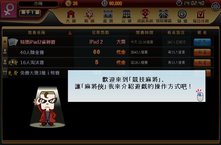 本週『競技麻將』特別推出可愛的“麻將俠〞,對於剛進入遊戲的玩家給予最親切的引導,無論玩家參加遊戲的人滿開賽制或者是定時開賽制,專業比賽的晉級玩法都可以讓新手玩家經過麻將俠的帶領而一目了然。