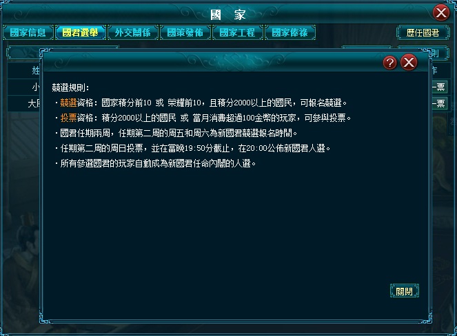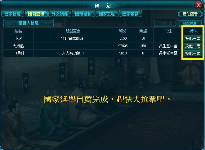 在《戰國龍魂》中,玩家不再是以各軍團為主,或以當上軍團長為先。在遊戲裡,玩家不再只是國家依附下的屬臣,而是可以經由選舉,取代七國之主,成為該國的國君,以統領全國的軍民一同與敵對抗。因此,不再是看誰的「拳頭大」,而是要比誰的「魅力高」,能夠讓所有國民選其為主。當上主君後,必須擬定外交方向及施政方針,若是不符合國民需求,任期一到,便可能失去臣民的支持,可謂不可不重視之。