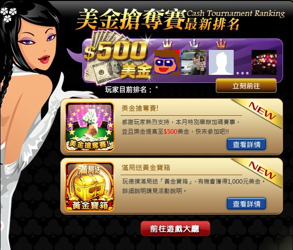 人外有人、天外有天!各位《黃金德州撲克》的高手,是時候證明你的實力了!即日起至12月15日活動期間,至競技區參加「美金搶奪賽」,每局獲得的勝利籌碼與勝利牌型都將換算成積分累計,每週總積分冠軍即可獲得大獎500元美金與冠軍徽章!前20名的玩家也能獲得百萬籌碼,超值獎勵等你來拿!