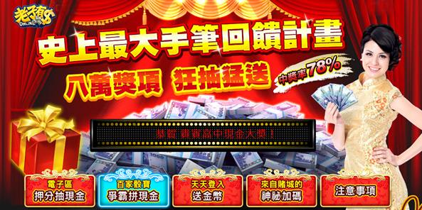 史上最大現金回饋計畫,保證同類型遊戲中獎率最高、最過癮的獨家活動開跑!暑假來臨夏日炎炎不如在家避暑玩老子;為回饋各位玩家《老子有錢Online》的支持,特地於7月18日至8月15日,史無前例好康大放送