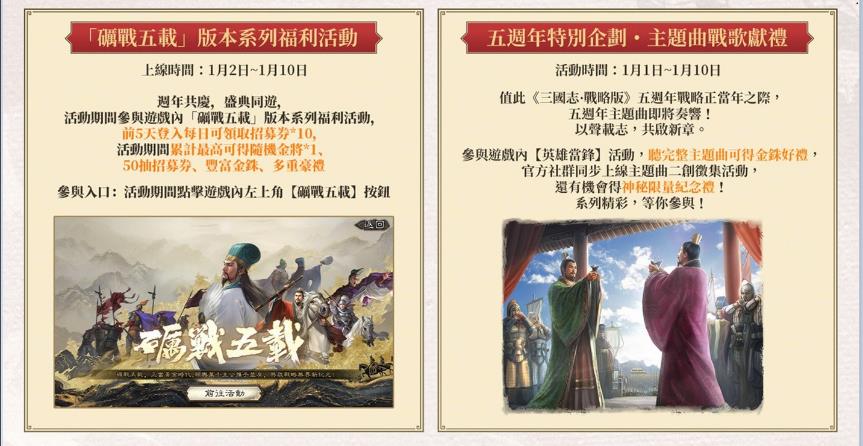 官方推出的「戰略・正當年」版本系列福利活動目前正在火熱進行中。其中,玩家參與「礪戰五載」 活動累計最高可獲得隨機金將、招募券和金銖等多重好禮,享受豐厚的福利獎勵。而從1月8日開始,遊戲內還將推出「記憶之卷」專屬活動。玩家可以進入遊戲查看個人專屬的五週年時光報告,與其他玩家共同回顧在《三國志・戰略版》中的熱血歲月,填寫五週年祝福寄語並發送彈幕留言,還可獲得金銖好禮。