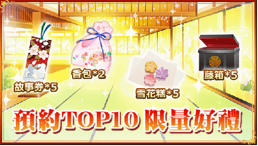 預約TOP10合作第二重預約好禮,精心規劃了預約TOP10專屬限量特典,搶先預約的玩家可以領取到推進劇情時不可或缺的故事劵、恢復體力的雪花糕,以及香包和藤箱等豐富道具喔!