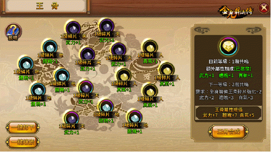 經由不斷的鍛鍊可提升「王骨碎片」的等級,當等級達到系統條件則會產生共鳴效果,並額外大幅提升三大屬性,靈活的運用「王骨鑲嵌」讓自己的陣容隊伍強度突飛猛進,打遍天下無敵手!