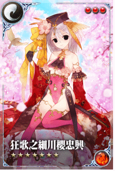 「★7狂歌之細川櫻忠興」出自「細川忠興」,是日本安土桃山時代及江戶時代的武將,他出生於京都,父親曾投靠織田信長,幼名熊千代,1577年協助討伐叛將松永久秀,攻佔森岡城,得到了信長的感謝狀,後來受到信長的任命成為了建部山城城主,並成功消滅一色氏並與父親藤孝成為了丹後國的守護。後與明智光秀三女玉子結進行婚姻。忠興十分溺愛著其妻伽羅奢。把她幽禁在和國邊境名為丹波之處,自稱是因為愛她、不願意失去她。也是因為不希望情勢變化連累到她,而做出的不得已的艱難抉擇。