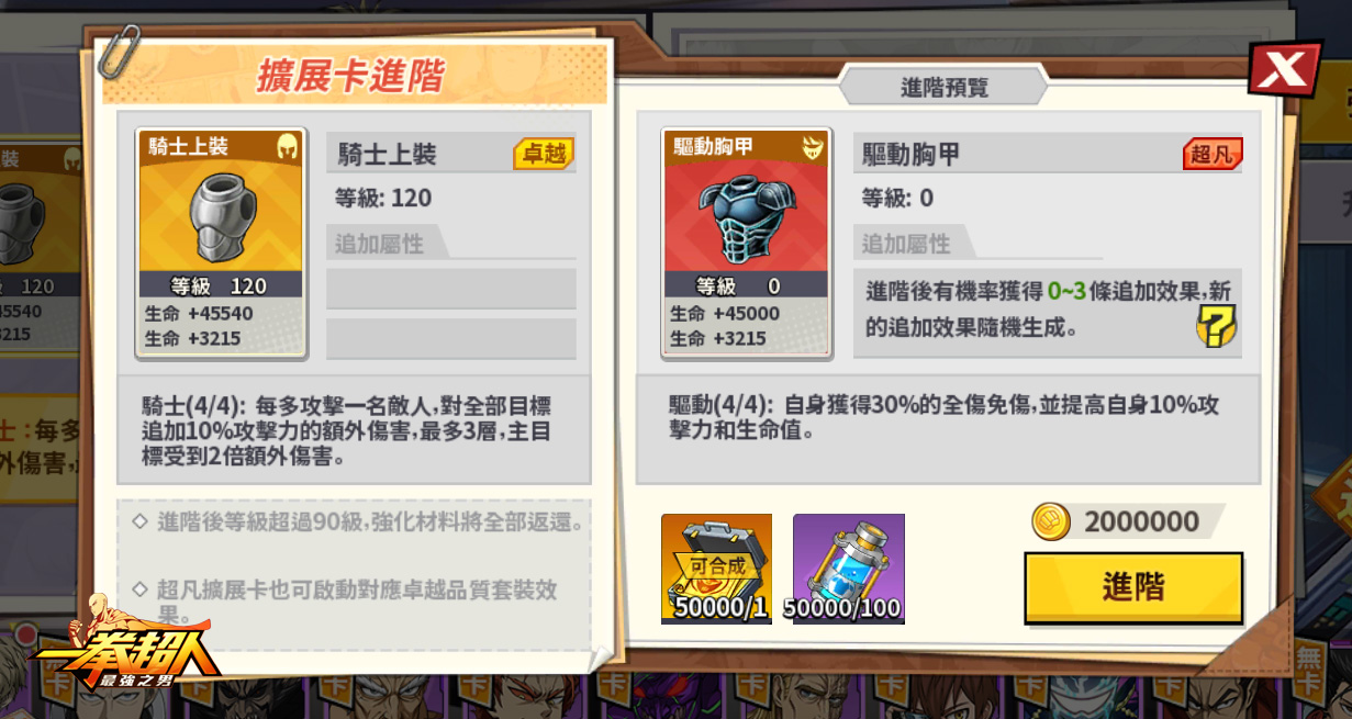 角色裝備中的卓越擴展卡,更高階段解鎖!凡將卓越擴展卡強化至90及,消耗融合劑,圖紙及金幣即可進階為超凡紅裝!進階後,超凡擴展卡強化等級變為0級,主屬性和副屬性的屬性類型不變,升星完全繼承。卓越進階成超凡後,有機率隨機獲得追加效果,且超凡紅裝擁有新的套裝效果,成套進階,邁向最強之路吧!