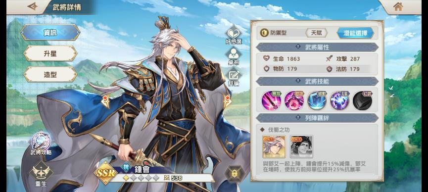 鐘會可以嘲諷敵方前排,保護己方後排,還能夠給己方後排增傷,屬於肉盾型武將。鄧艾則可以攻擊敵方後排,提升隊友對敵方後排的暴擊率。鐘會與鄧艾有羈絆關係,同時上陣雙方可分別提升15%的減傷與傷害。