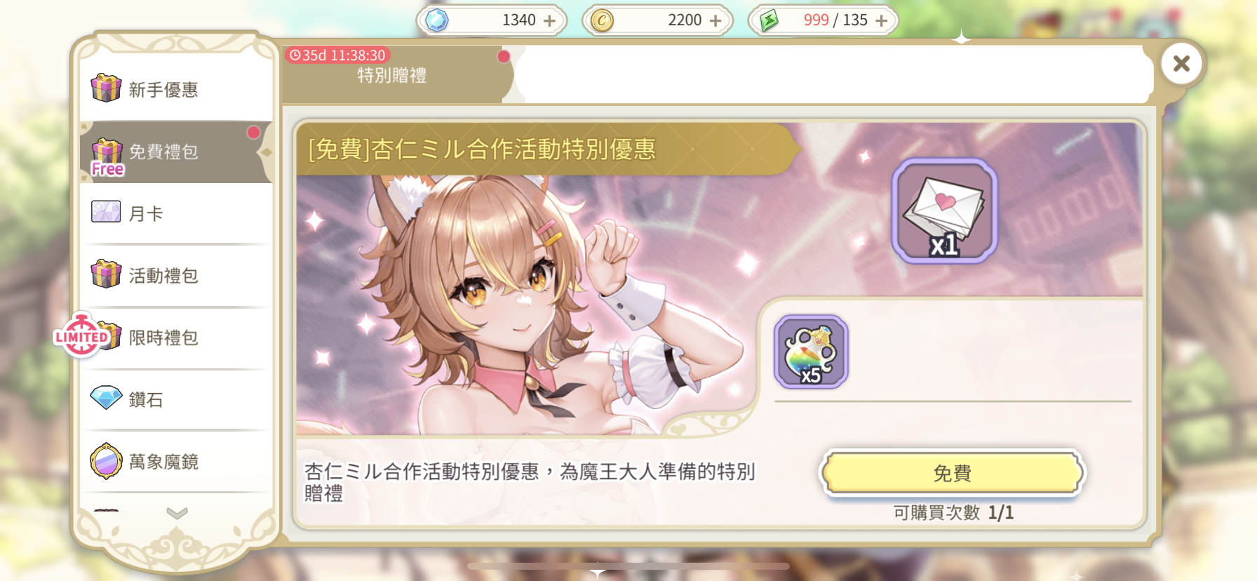 在禮包中可以免費領取一次"杏仁ゐォ合作特殊召喚十抽券",使用該召喚券獲得杏仁ゐォ的機率會提升喔,快來把調皮小貓咪帶回家吧!