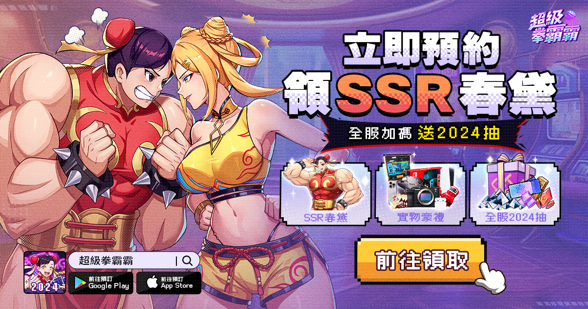 即日起,前往《超級拳霸霸》事前預約網站進行預約,即可獲得預約豪華大禮,2024抽、超讚的SSR角色春黛、一千萬代幣領到手軟,開局就起飛,讓你體驗隨心所欲清空商店的快感!不僅如此,完成商店預約還有機會抽取復古街機、iPhone15 PRO等超值實物大獎!