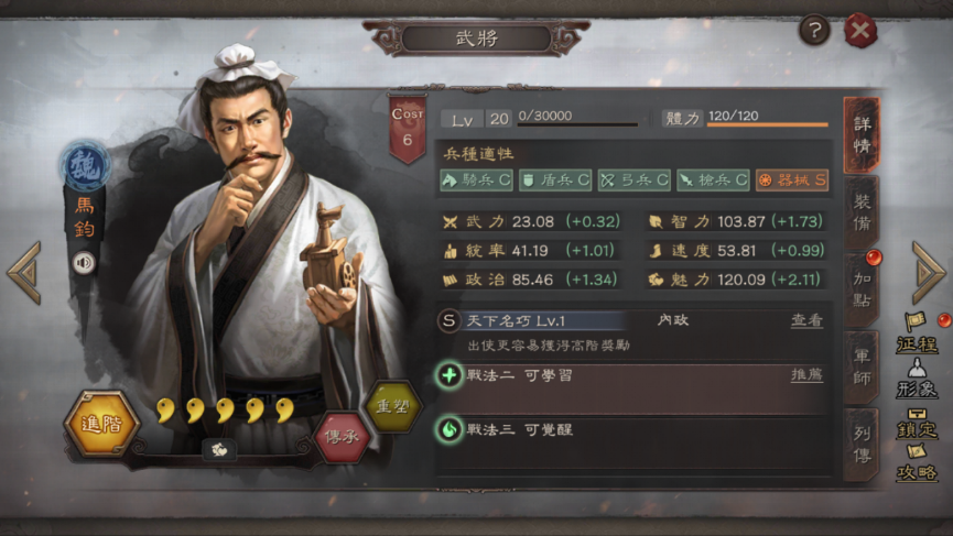新登場武將馬鈞則更是另一番風貌——自帶戰法「天下名巧」可提升出使時獲得高階獎勵的機率,傳承戰法「別具匠心」則能提升自身魅力值,在內政與發展方面表現亮眼。