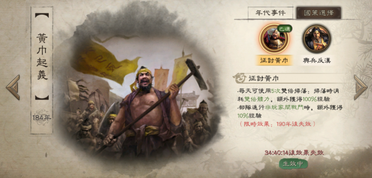 不僅如此,部分年代事件還將解鎖「國策」選項,提供多種資源與武將加成。主公可依據自己的戰略風格與陣容搭配,自行選擇限時或永久國策,打造最適合自己的發展節奏,進一步強化整體實力,譜出自己的專屬歷史篇章!