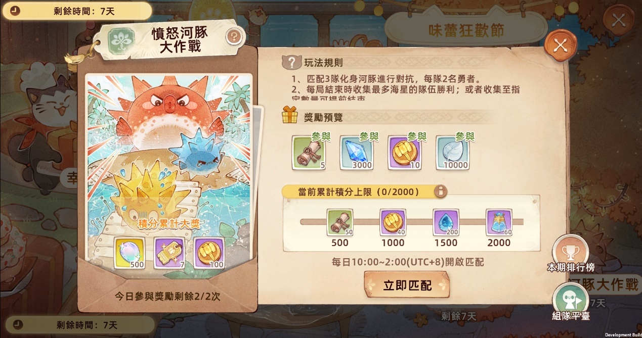 【憤怒河豚大作戰】讓勇者化身河豚,在三個隊伍中展開2V2V2的對抗,並體驗收集海星的樂趣,獲勝隊伍可領取限時聊天框、限時稱號、記憶結晶、時裝扭蛋券等獎勵。