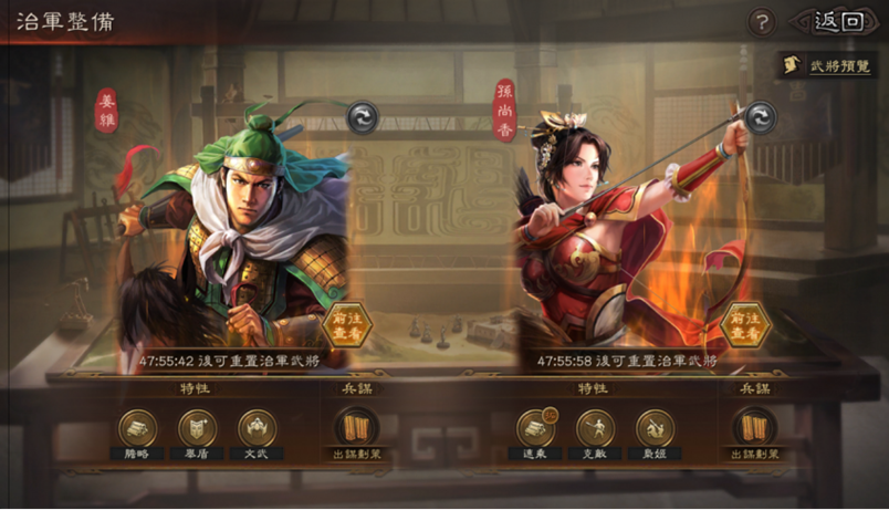 如同經典設定,每位武將都配備獨特治軍特性,共有10個策略點,主公可任意選擇 2 名治軍武將並分配軍略點研習特性。特性消耗 2~5 點策略點不等,考驗主公在有限資源下如何取捨,打造最符合自身戰略需求的配隊方向。